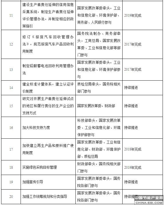 《方案》提出,到2020年,生产者责任延伸制度相关政策体系初步形成,产品生态设计取得重大进展,重点品种的废弃产品规范回收与循环利用率平均达到40%。到2025年,生产者责任延伸制度相关法律法规基本完善,产品生态设计普遍推行,重点产品的再生原料使用比例达到20%,废弃产品规范回收与循环利用率平均达到50%。
