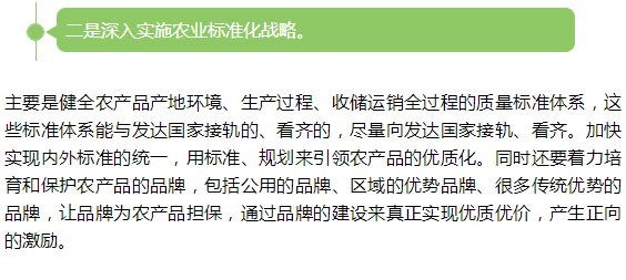 国新办6日举行新闻发布会,解读《中共中央国务院关于深入推进农业供给侧结构性改革加快培育农业农村发展新动能的若干意见》有关情况,中央农村工作领导小组副组长、办公室主任唐仁健介绍,在中央一号文件中明确提出“质量兴农”,强调绿色发展要突出一个“绿”字,通过转变农业发展导向,实施农业标准化战略、推行绿色生产方式、健全农产品质量和食品安全的监管体制等四大措施推进农业的绿色发展。