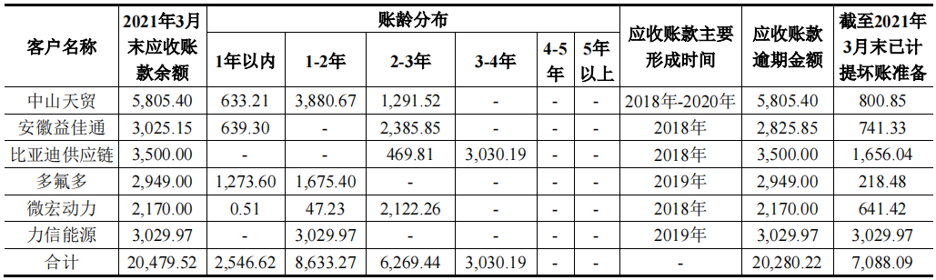 2018年-2021年第一季度,振华新材各期末应收账款余额分别为54,608.99万元、45,184.10万元、55,515.55万元、77,458.95万元,占当期营业收入比例分别为20.57%、18.61%、53.56%、78.51%。应收账款金额及占当期营业收入比例持续增长,存在客户依赖度强、下游需求波动等行业共通问题。