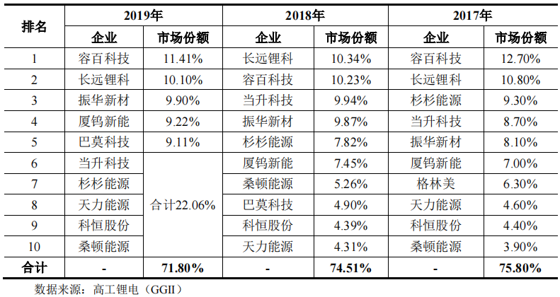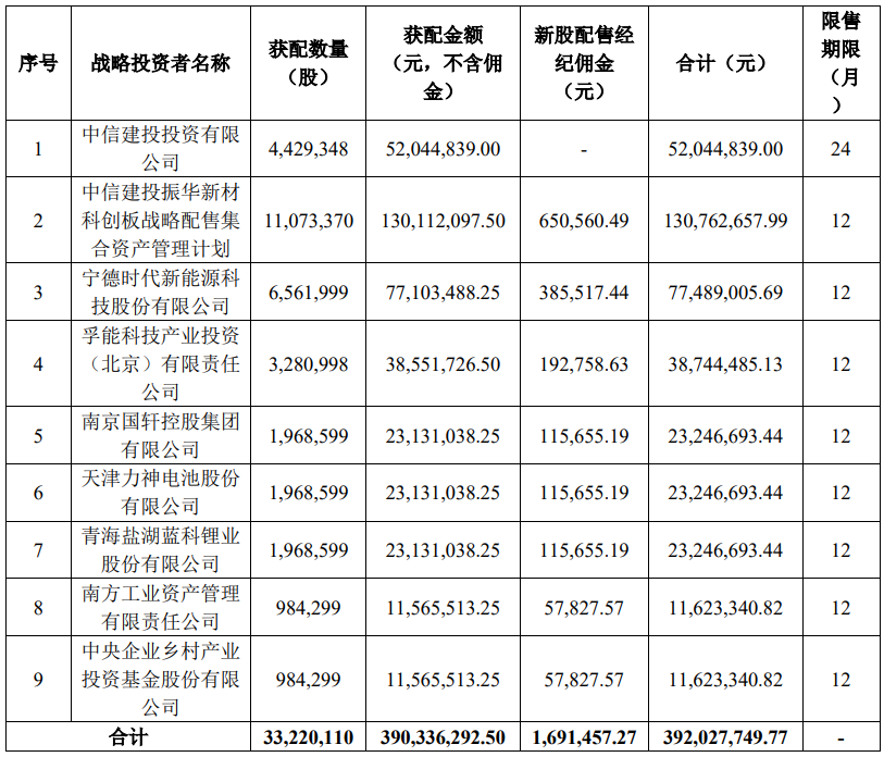 9月5日晚间,振华新材公布网上发行中签结果。本次公开发行股票1.11亿股,占发行后总股本比例不低于25%,发行价格为 11.75 元/股,预计募资总额约13.01亿元。招股书中披露,本次募资金额将用于锂离子电池正极材料、锂离子动力电池三元材料生产线建设以及补充流动资金。