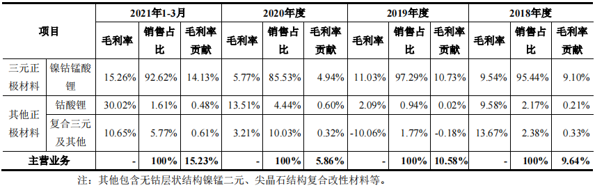 2018年-2020年,振华新材主营业务毛利率分别为9.64%、10.58%、5.86%。2021年以来由于新能源终端的高景气度,振华新材的毛利率有所回升。振华新材称,毛利率低的主要原因在于其生产所用主要原材料三元前驱体均来源于外购,自身尚未布局上游三元前驱体生产业务,因此三元正极材料单位材料成本相对较高,受原材料公开市场价格波动、产销量波动的影响更大。