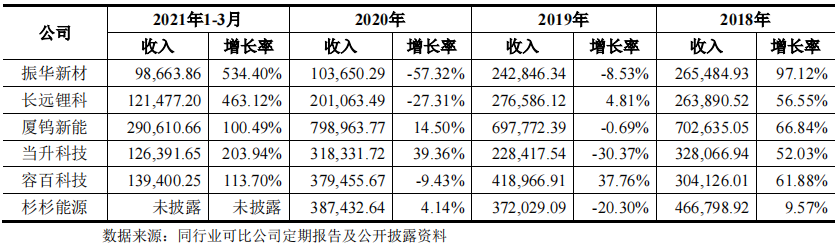 近三年来,振华新材业绩波动较大。2018年-2020年,该公司分别实现营收26.55亿元、24.28亿元、10.36亿元;净利润分别为6932.11万元、3376.36万元、-1.7亿元。2021年第一季度,该公司营收近9.87亿元,同比增长534%,净利润为7689.23万元。 本次发行的初始战略配售数量为3322万股,占发行总规模的30%。宁德时代、孚能产投、南京国轩、天津力神、蓝科锂业、南方资产等产业上下游企业参与了振华新材的战略配售,并就市场、技术、供应链等内容与公司签订了《战略合作协议》。其中宁德时代、孚能科技、南京国轩是振华新材的主要客户,蓝科锂业是振华新材的锂资源供货商。振华新材的客户集中度较高,2018年-2021年第一季度该公司对前五大客户销售金额占当期营业收入的比例分别为85.67%、93.55%、89.56%、95.39%。其中,宁德时代是振华新材的第一大客户。2021年第一季度,振华新材对宁德时代销售金额为6.4亿元,占营业收入的65.11%。