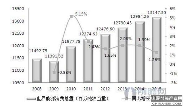 从世界能源消费总量来看,根据前瞻产业研究院《2017-2022年中国新能源(600617)行业发展前瞻与投资战略规划分析报告》最新数据显示,到2015年世界消费总量已经达到了13147.30百万吨油当量,2016年的消费总量保守估计会上升到132亿万吨油当量。从能源发展的总体情况来看,在世界经济平稳运行的前提条件下,能源行业的长期发展必然遵循稳定的低速增长态势。年均增速维持在1%到2%区间浮动。