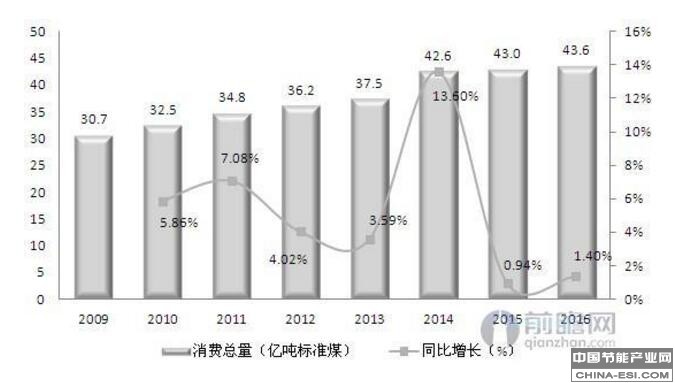 图表:2009-2016年我国能源消费总量及同比增速(单位:亿吨标准煤,%)