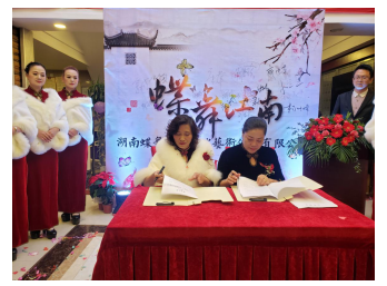在此次揭牌仪式上蝶舞江南品牌与香港金蝉玉服装公司签订了全球的战略伙伴关系,为蝶舞江南品牌走向国际奠定了基础。