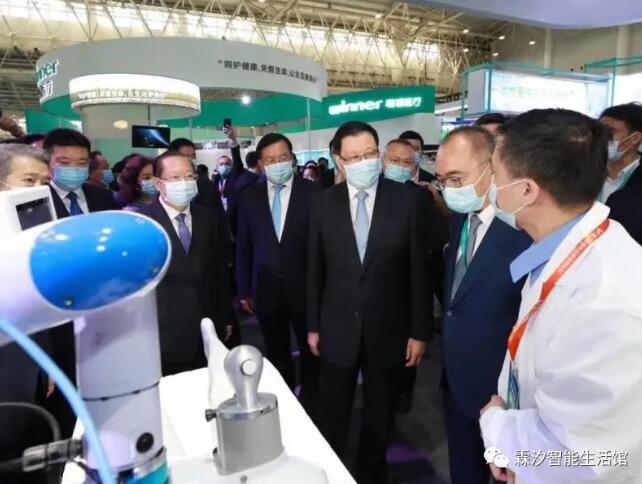 本次健博会健康共同体及每个场馆门口的近百台智能机器人均由湖北人工智能明星企业——武汉霖汐科技有限公司(简称:霖汐科技)提供。应勇书记、王晓东省长等领导及与会嘉宾共同在健康共同体处驻足,并由讲解人员详细介绍了本次大会的机器人科技元素,展示了湖北省在科技抗疫过程中的部分成果。
