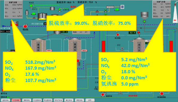 试运行期间,该装置保持了良好的性能指标,脱硫效率达到99%,脱硝效率达到75%,粉尘排放值达到10mg/Nm3以下,各项指标基本达到“超低排放”标准.
