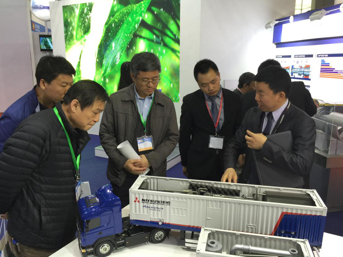 基础设施提供最佳方案。在分布式电源的产品线领域,从可急速启动的航改型燃机,重型燃机到各个等级的燃气发动机,有机朗肯循环涡轮机,根据用途的不同,三菱集团拥有丰富的产品线。博览会上所展示的集装箱式燃气发动机,具有24小时内快速移动、快速设置、快速发电、快速维修的特点,利用热电联产系统,综合效率达到74.6%,发电率高达42.6%,NOx 排放达到200ppm 以下。