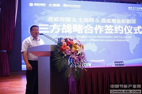 在签约仪式上,土流网创始人兼CEO伍勇、通威惠金新能源有限公司总经理冯德志、通威传媒总经理甘晓飞先后发言。