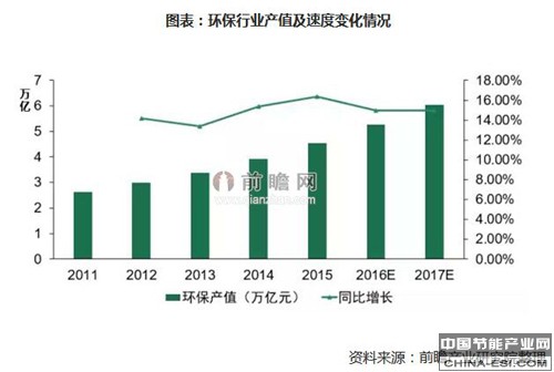 由于环保产业具有市场规模大、波动较小等优势。因此在此次“十三五”规划提出的诸多项目中,环保项目占据多数。据前瞻产业研究院《中国环保行业报告》的分析,预计到2017年我国环保行业的产值将会达到6万亿元,并且会以15%左右的年复合增长率上涨。
