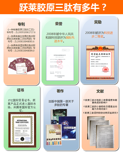 实际上,世界上所有的胶原蛋白的制造,不管是采用鱼皮、鱼鳞还是牛骨、猪骨,都是采用水解技术进行生产的。水解技术并不是谁家的专利技术,而是生物制造领域最常规的制造技术。只有武汉跃莱健康产业有限公司所使用的“复合酶梯度定向酶切”专利技术,才是全球领先的专利技术!这个技术不仅能够将大分子的胶原蛋白水解成小分子的蛋白,并且还能准确的筛选出最具有功能性的“胶原三肽(甘氨酸、脯氨酸、羟脯氨酸)”的片段。也正因为此,跃莱公司所使用的胶原三肽,获得了《国家科技进步二等奖》。