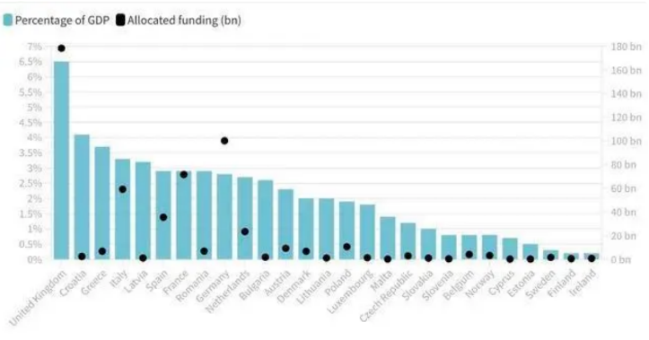 布鲁盖尔研究所统计了2021年9月至2022年9月期间27个欧洲国家为缓解能源危机、减轻家庭和企业重负推出的纾困措施,包括向国内困难家庭和消费者发放补助、降低电力增值税率、供暖补贴、对一些能源企业的支持等等。截至目前,这些措施的合计金额约为5000亿欧元。其中,排名第一的英国拨款额高达1784亿欧元,占其GDP的6.5%。