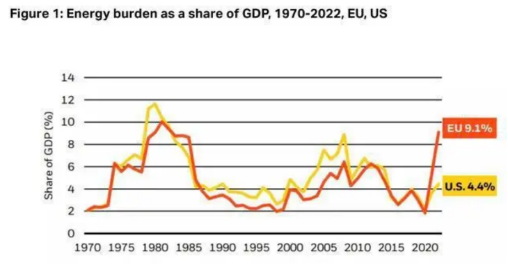 从价格飙升下能源采购成本变化的角度看,布鲁盖尔的另一项研究显示,欧盟目前将其国内生产总值的约9%用于能源消费,创40年来最高水平。相比之下,美国将其GDP的4.4%用于能源消费,与历史平均水平相比较低。