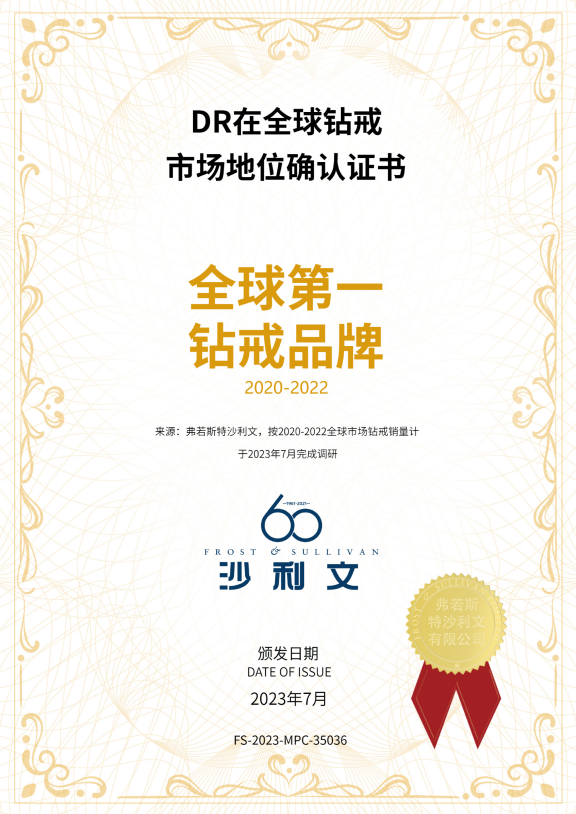 从2020到2022年,DR钻戒已经连续三年位居全球求婚钻戒销量第一。弗若斯特沙利文经过全球数据调研,数据显示,DR是“全球第一求婚钻戒品牌”和“全球第一钻戒品牌”。业内人士分析称,DR之所以能够成为全球第一的求婚钻戒品牌,主要是凭借其独特品牌理念、产品硬实力、高坪效旗舰店以及3000万的真爱粉丝。