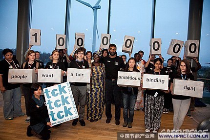 tcktcktck是一个全球性的联合组织,中文意思是“嘀嗒,嘀嗒,嘀嗒”,形象是一个闹钟,意为时间紧迫,请赶快行动,不要再拖。直到现在为止,他们已经收集到了超过一千万个签名,表示希望气候会议能达成一个公平,有效,有约束力的结果,简称FAB(Fair, Ambitious, Binding) deal。