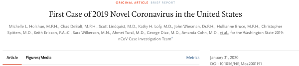 论文显示,2020年1月19日,一名35岁的男子出现在位于华盛顿州斯诺霍米什郡(Snohomish)的一家急诊所,他有4天(自1月16日起)的咳嗽和发热病史。病人在候诊室里戴上了口罩,等待了大约20分钟后,他被带进检查室,并接受了医生的评估。