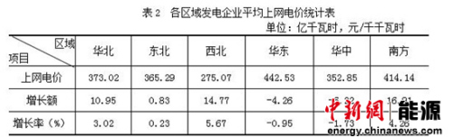 从区域看,华东区域平均上网电价最高,为442.53元/千千瓦时,依次为南方、华北、东北、华中,西北最低,为 275.07元/千千瓦时(见表2)。