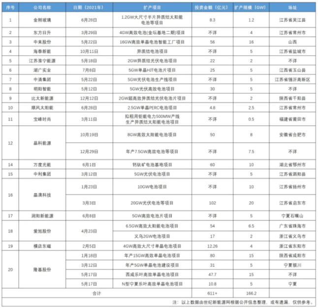 2021年,电池片投资总额保守估计611亿元,容量则超166GW。