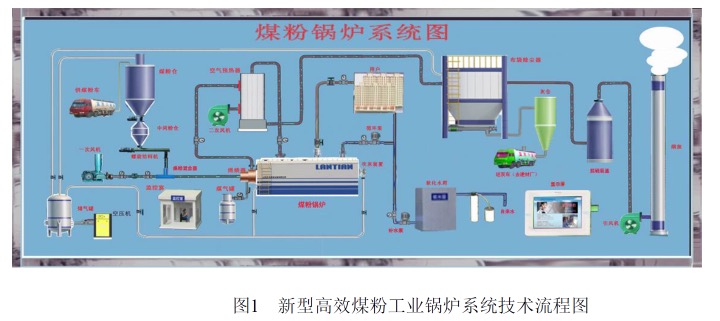 新型高效煤粉工业锅炉系统技术工艺流程主要为:煤粉接受和储备(或炉前在线制粉)→