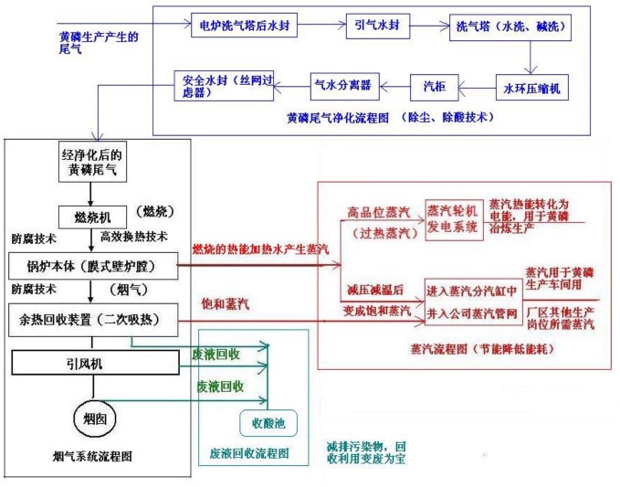 黄磷生产过程余热利用和尾气发电(供热)技术是对黄磷尾气处理、尾气燃烧热能、尾气燃烧后(烟气中)排放物循环使用的综合利用系统,其主要的关键技术如下: