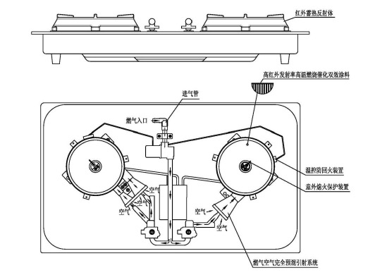 采用高红外发射率多孔陶瓷替代传统的铜、铁铬铝和镍铬合金等高耗能稀缺金属材料制备燃烧器;采用全预混无焰燃烧技术,把燃气燃烧产生大部分热量以红外线辐射的方式传递给受热体。通过采用完全预混式催化燃烧技术,精确控制空燃比,并使混合更均匀,既保证燃烧更完全,减少不充分燃烧带来的化学热损失,同时也减少过剩空气所带走的热量,并且可有效抑制一氧化碳和氮氧化物的生成。通过红外线辐射传热,燃烧面温度高,传递距离短,大大减少热量传递过程的物理热损失。燃烧器表面采用高辐射率红外涂层,并使涂层红外发射波长窗口与受热体红外吸收波长窗口尽可能匹配,进一步提高热量吸收效率。采用红外无焰燃烧技术,无明火,彻底消除炭黑产生的根源,也减少了锅底集炭造成的热效率下降的隐患。