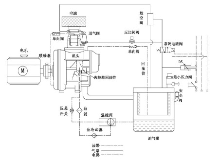 (1)压缩空气流程:空气通过进气过滤器将大气中的灰尘或杂质滤除后,由进气控制阀进入压缩机一级主机,在压缩过程中与喷入的冷却润滑油混合,经压缩后的混合气体从一级压缩腔排入联接腔,在联接腔内与喷入润滑油混合冷却,进入二级主机进气腔,并经行压缩、提高压力,从两级压缩腔排入油气分离罐。
