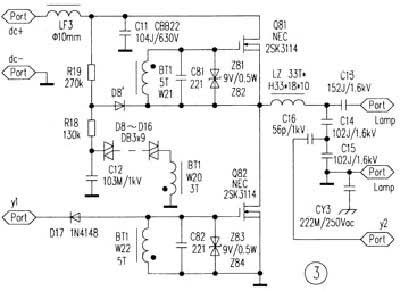逆变器的振荡频率由绕组W21、W22的电感量与场效应管Q81、Q82的输入电容以及补偿电容C81、C82共同决定,灯回路网络的谐振频率必须与输入回路的谐振频率相同,例如:谐振频率为2.65MHz。还要尽力优化Q81、Q82驱动信号的幅度和波形,使其自身功耗降到最低。