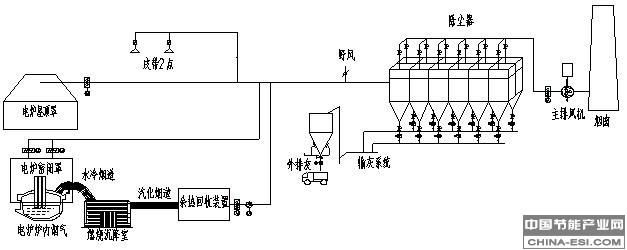 电炉第四孔的炉气,经炉盖弯管和移动弯管烟道之间的间隙,进入移动弯管烟道,同时抽入一定量的炉外空气,以燃烬炉气中的CO等可燃气体形成高温烟气,高温烟气依次经过沉降室、汽化烟道、余热锅炉及节能器生产一定压力的蒸汽供生产生活使用,同时经余热利用系统后的烟气温度降到约250℃,与来自大密闭罩及屋顶除尘罩温度为6O℃的二次废气相混合,混合后的废气温度低于130℃,进除尘器净化,并经风机排往大气。